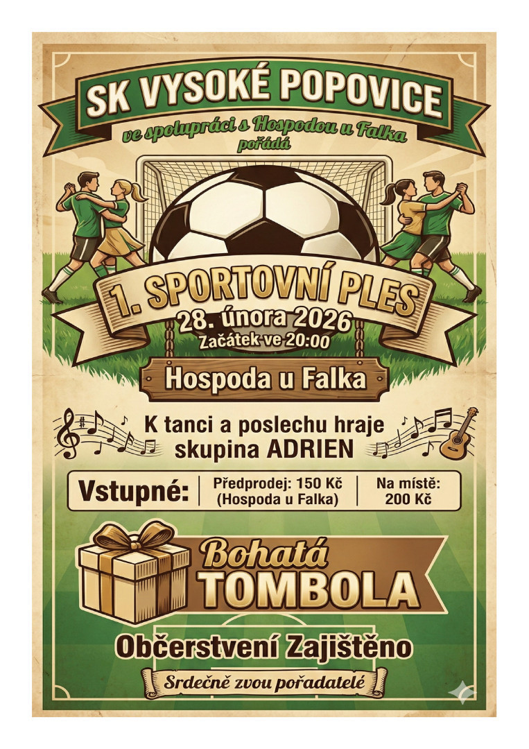 1. sportovní ples, který pořádá SK Vysoké Popovice a Hospoda u Falka začíná 28.2.2026 ve 20:00