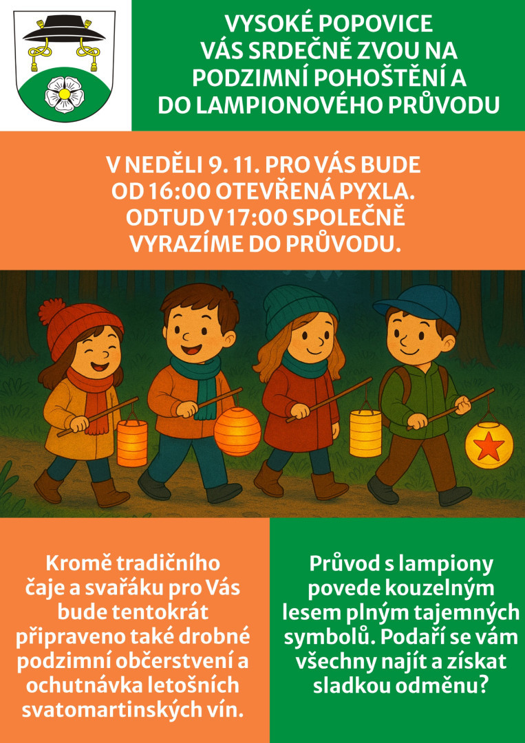 Zveme děti i dospělé na Svatomartinský lampionový průvod, který tentokrát odstartujeme již v 16 hod. podzimním pohoštěním v Pyxle. Děti se pak vydají v 17 hodin na lampionový průvod lesem. Těšíme se na Vás!