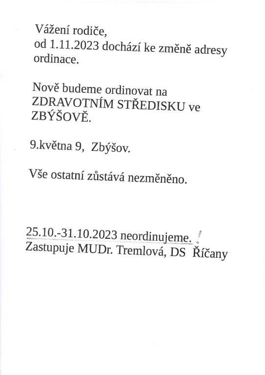 Dětská ambulance, MUDr.Stránská, v Domě zdraví Zastávka oznamuje, že od 1.11.23 je dětská ambulance v Zastávce zrušena.