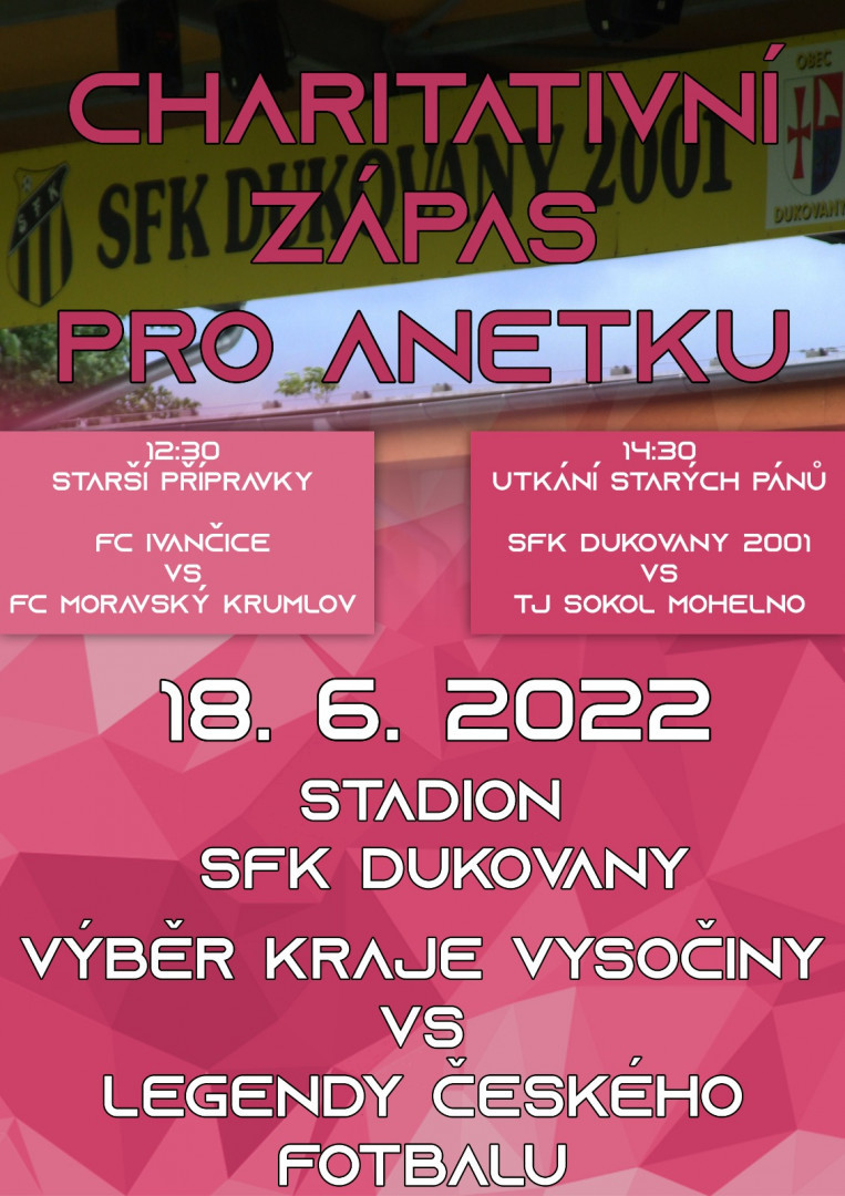 Charitativní projekt Kopačky pomáhají, který se zaměřuje na organizaci charitativních sportovních exhibicí, letos pořádá fotbalovou exhibici v Dukovanech, která se bude konat 18. června. Výtěžek z této charitativní exhibice bude věnovaný na konkrétní dítě - Anetku (8 let), která přišla o rodinu příčinou pandemie a aktuálně vyrůstá pouze s babičkou.