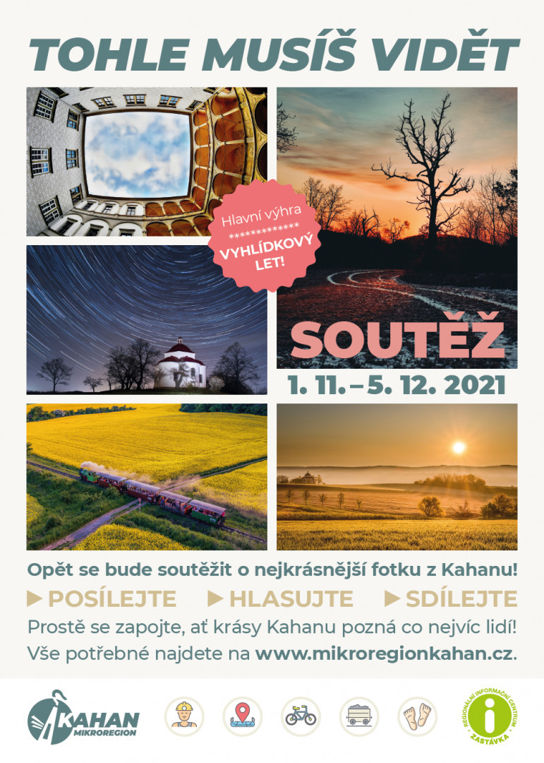 1. 11. spustí mikroregion Kahan třetí ročník fotografické soutěže. Její podtitul zní Tohle musíš vidět. Autoři tak ukážou své oblíbené místo v oblasti, zajímavý moment, detail, prostě snímek, nad kterým "tohle musíš vidět" řeknou nejen oni, ale při sdílení a lajkování také hlasující a nakonec porota. Hlavní cenou je výjimečný vyhlídkový let, který s výhercem ve svém malém letadle podnikne mistr Evropy v navigačním létání Václav Puža. Atraktivní výhry čekají na autory, kteří se umístí v top 10. Na jaře 2022 ze soutěžních snímků vznikne výstava.