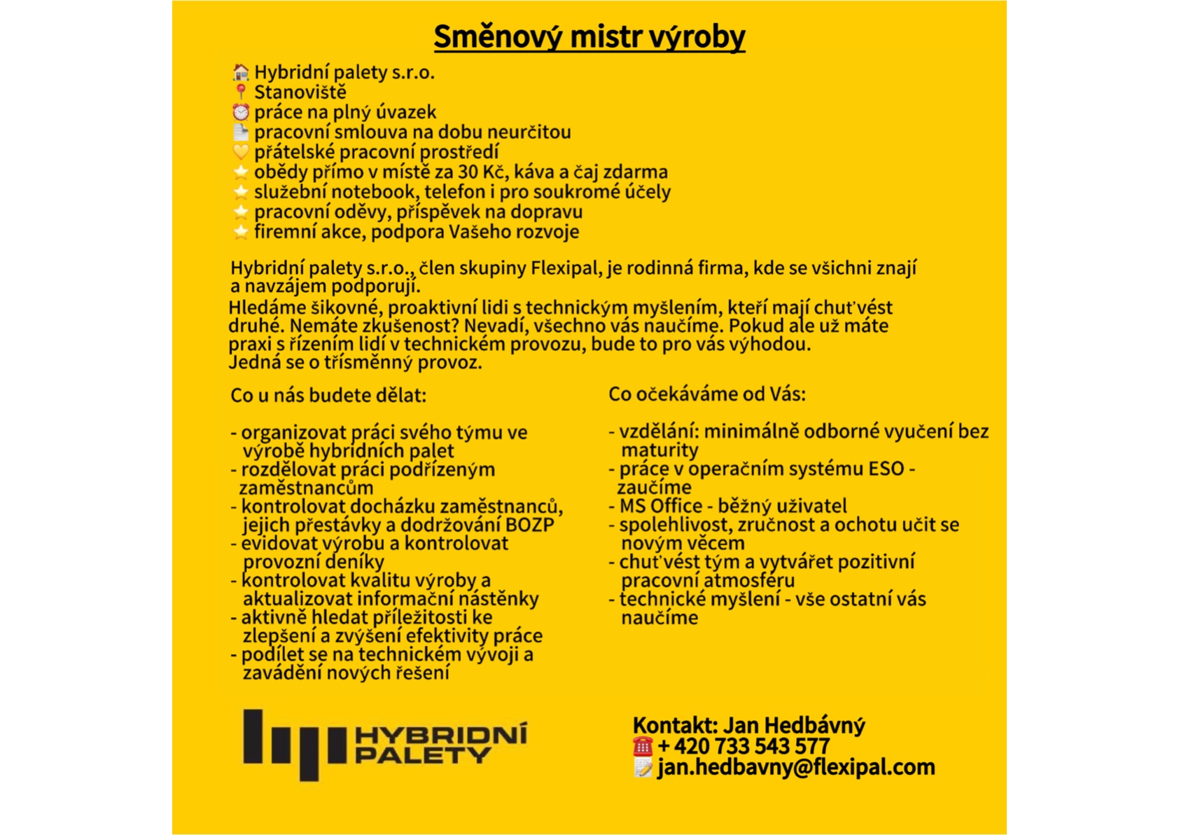 Do našeho provozu výroby ve Stanovištích hledáme šikovné lidi, směnové mistry.