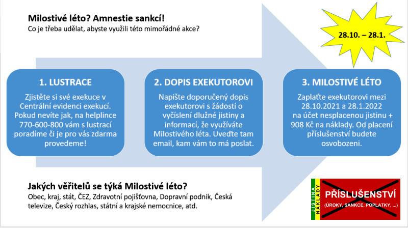 Jedním ze schválených opatření je i tzv. „Milostivé léto“. Nabídka státu na odpuštění tzv. příslušenství, tedy úroků, penále či pokut u exekucí, které jsou vedeny pro dluh vůči veřejnoprávní instituci (dle definice v zákoně o přístupu o svobodném přístupu k informacím). Jedná se tedy mimo jiné o obce a města, ale i všechny organizace, kde mají města podíl, jako jsou nemocnice, dopravní podniky apod. Zachovává se základní pravidlo, dluhy se mají platit. Dlužník chtějící milostivé léto využít musí během 90 dnů s účinností od 28. 10. (nejpozději tedy do 28. 1. 2022) uhradit celou dlužnou jistinu a náklady ve výši 908,- vč. DPH exekutorovi. Na základě těchto kroků mu bude exekuce zastavena. Je to šance pro mnoho lidí v dluhových pastech na nový životní restart. Je toto reálná šance, jak se s částí nahromaděných exekucí vypořádat a pomoci tak odbřemenit i administrativu obcí a měst spojenou s vymáháním dluhů.