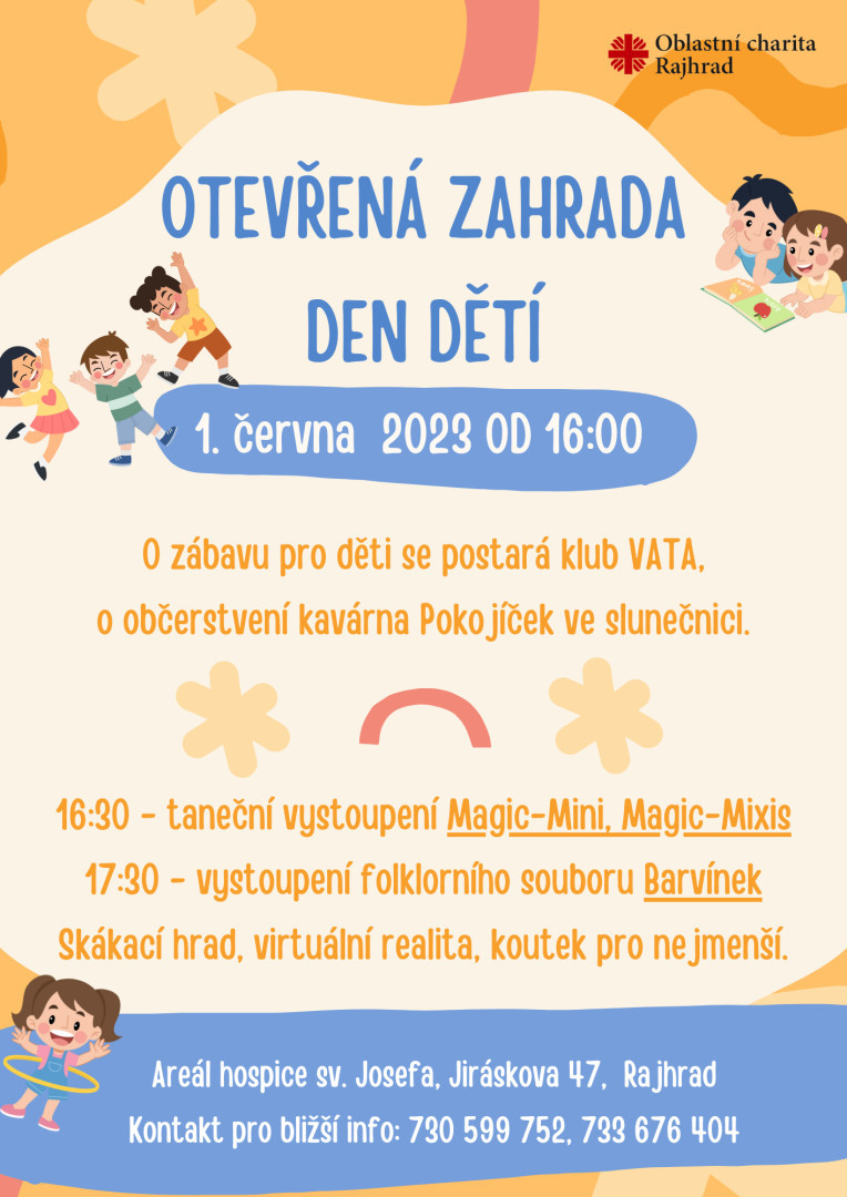 přijměte srdečné pozvání Oblastní charity Rajhrad na Den dětí, který pořádá ve čtvrtek 1. 6. 2023 v areálu hospice od 16:00. Součástí budou soutěže pro děti, skákací hrad, virtuální realita a taneční vystoupení souboru Barvínek a Magic-Mini, Magic-Mixis.