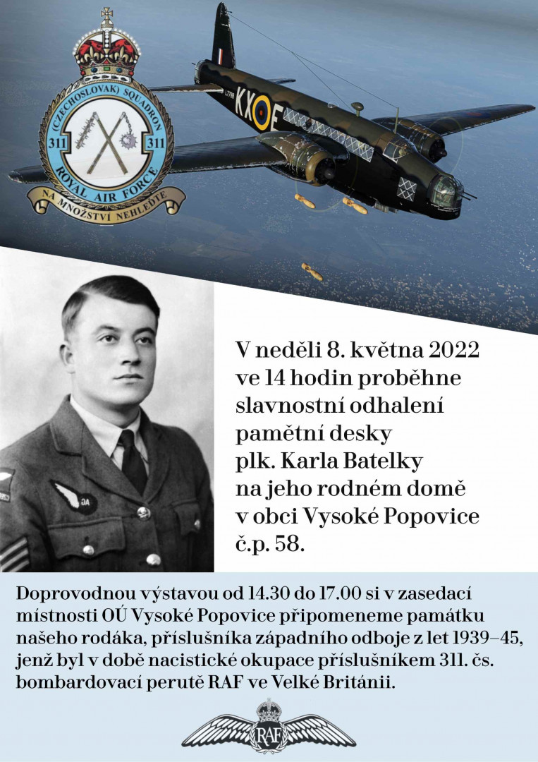 V neděli 8. května ve 14.00 u rodného domu plk. Batelky odhalíme pamětní desku našemu rodákovi.