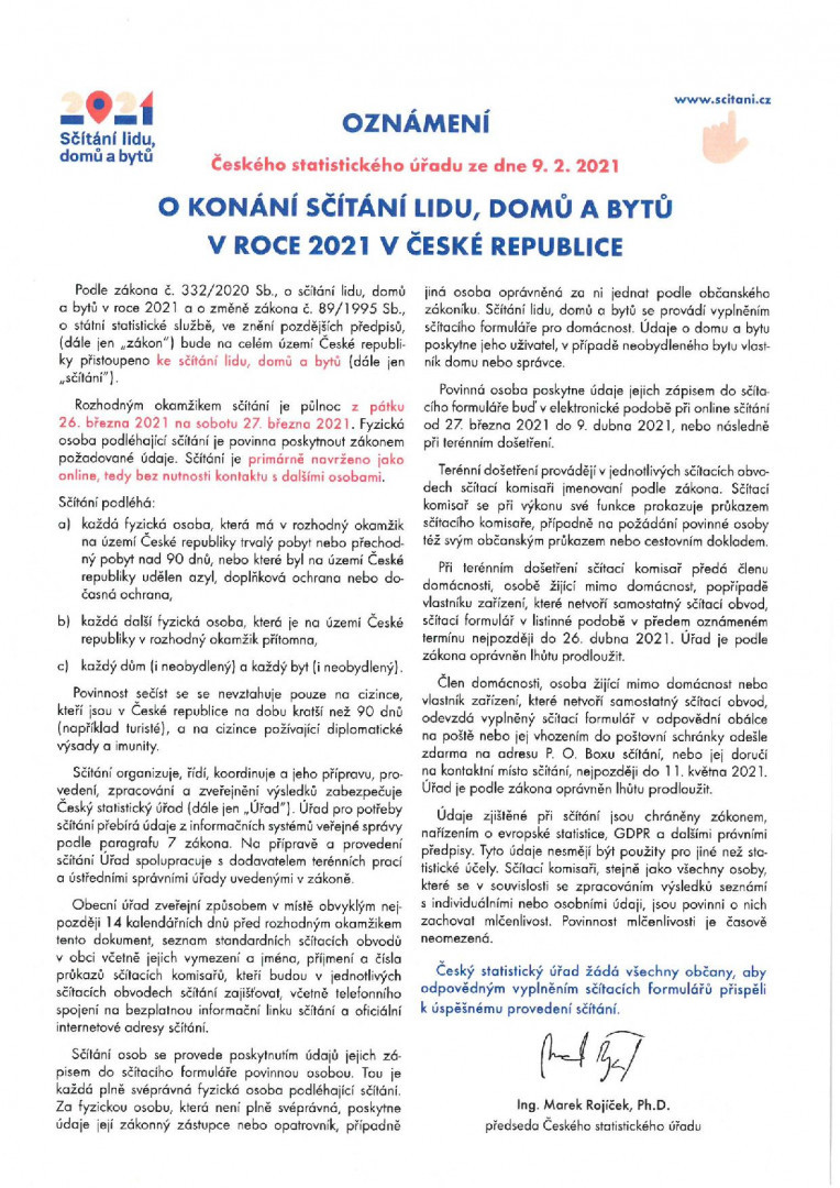 Oznámení ke sčítání lidu 2021