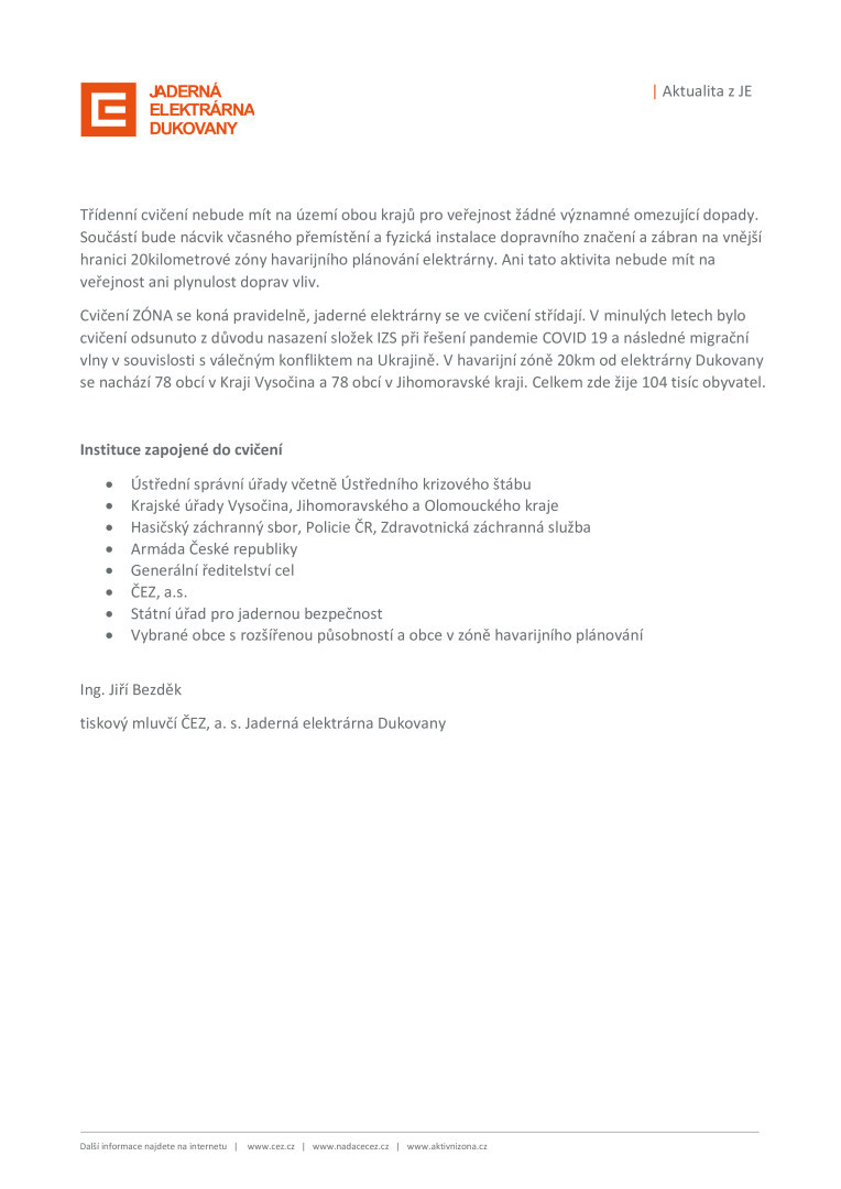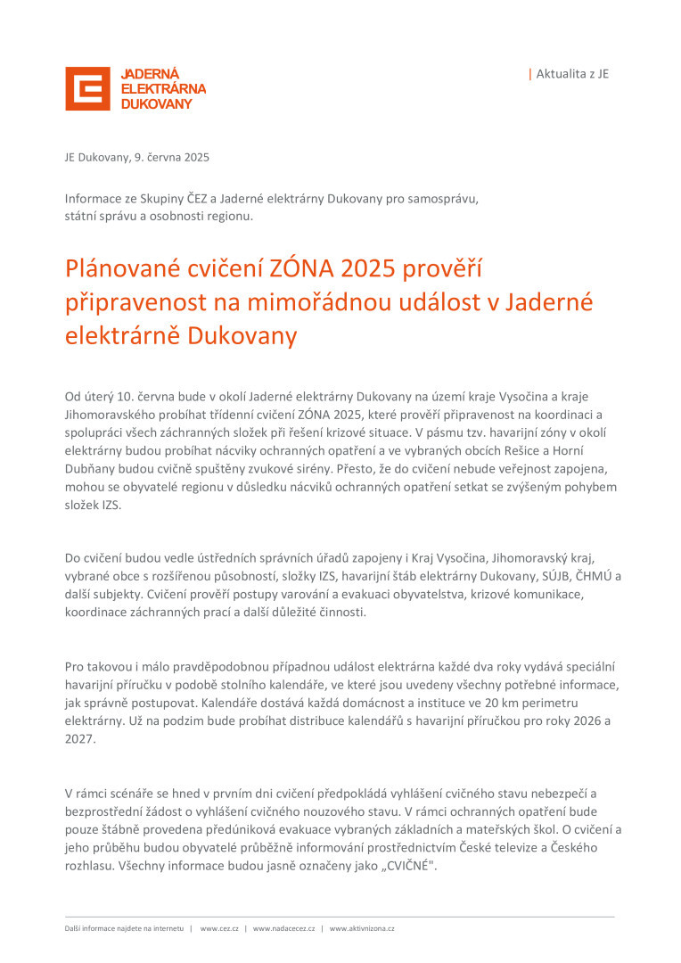 Oznámení o plánovaném cvičení Zóna 2025 na Jaderné elektrárně Dukovany