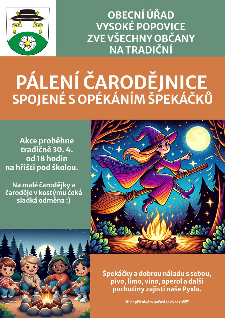 Tradiční pálení čarodějnic proběhne 30.4. v 18:00 pod školou.