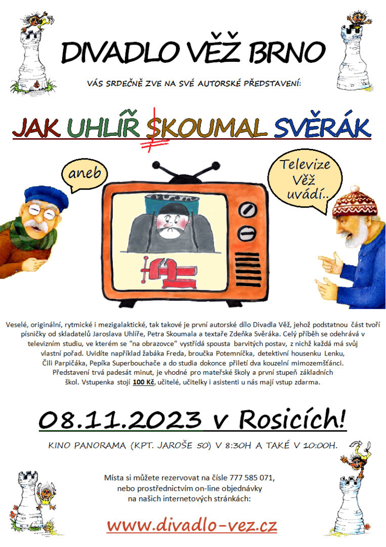 Srdečně vás zveme na veselé, pohádkové představení, jehož název i veškeré další informace, najdete v přiloženém plakátku. Pokud si chcete rezervovat místa, zavolejte na níže uvedené telefonní číslo, nebo jen vyplňte objednávkový formulář, který najdete zde:
