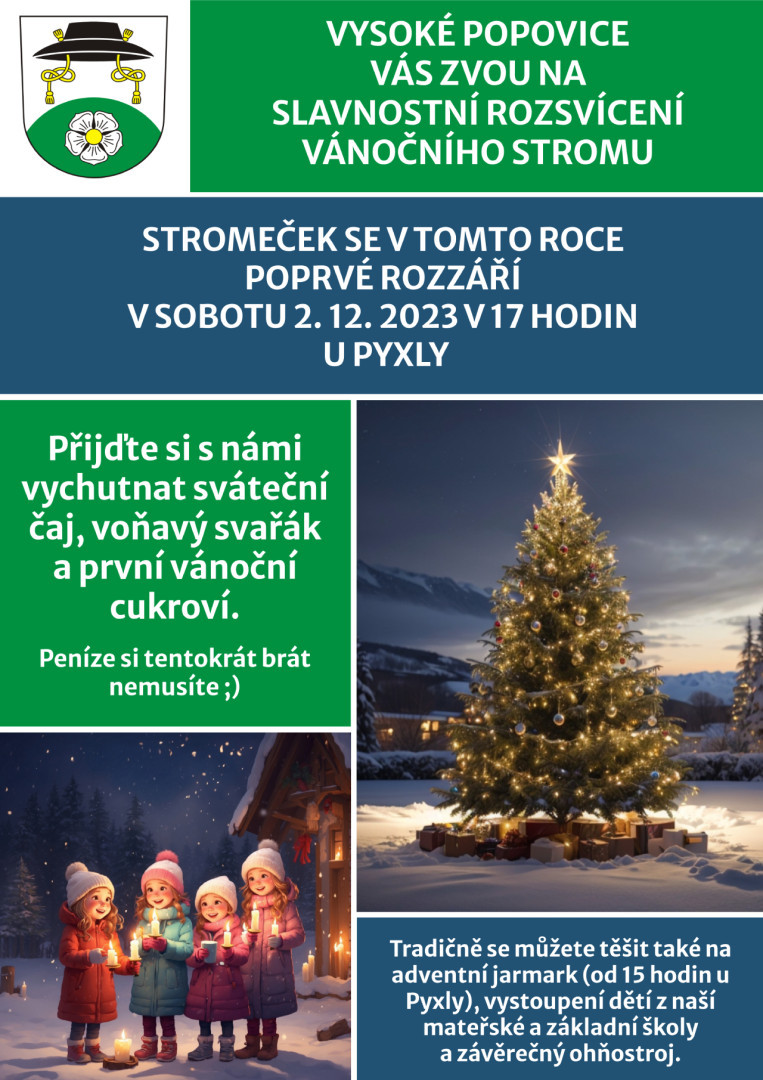 Přijďte s námi slavnostně rozsvítit obecní vánoční strom. Akce se uskuteční v sobotu 2. 12. 2023 v 17 hodin u Pyxly, kde bude zároveň už od 15 hodin probíhat vánoční jarmark. Podrobnější informace naleznete v letáčku.