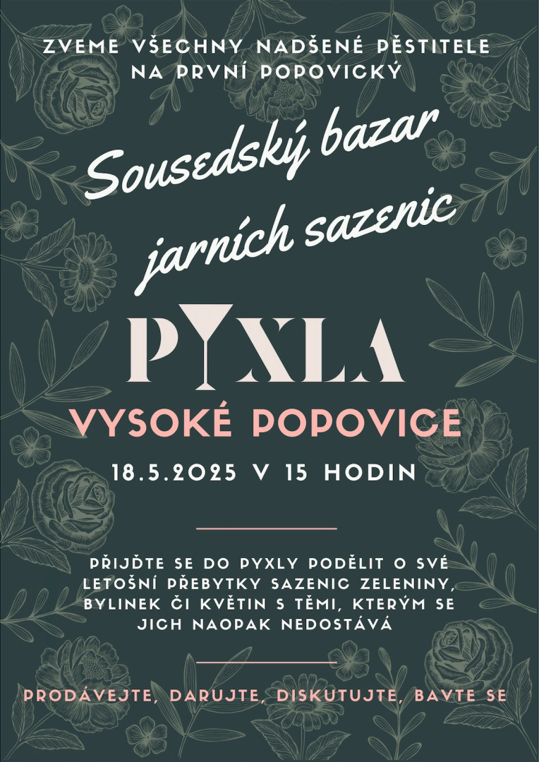 Zveme všechny milovníky zahrádek a květin na první popovický sousedský bazar jarních sazenic, který se uskuteční v neděli 18. 5. 2025 od 15.00 hodin v prostorech naší Pyxly.